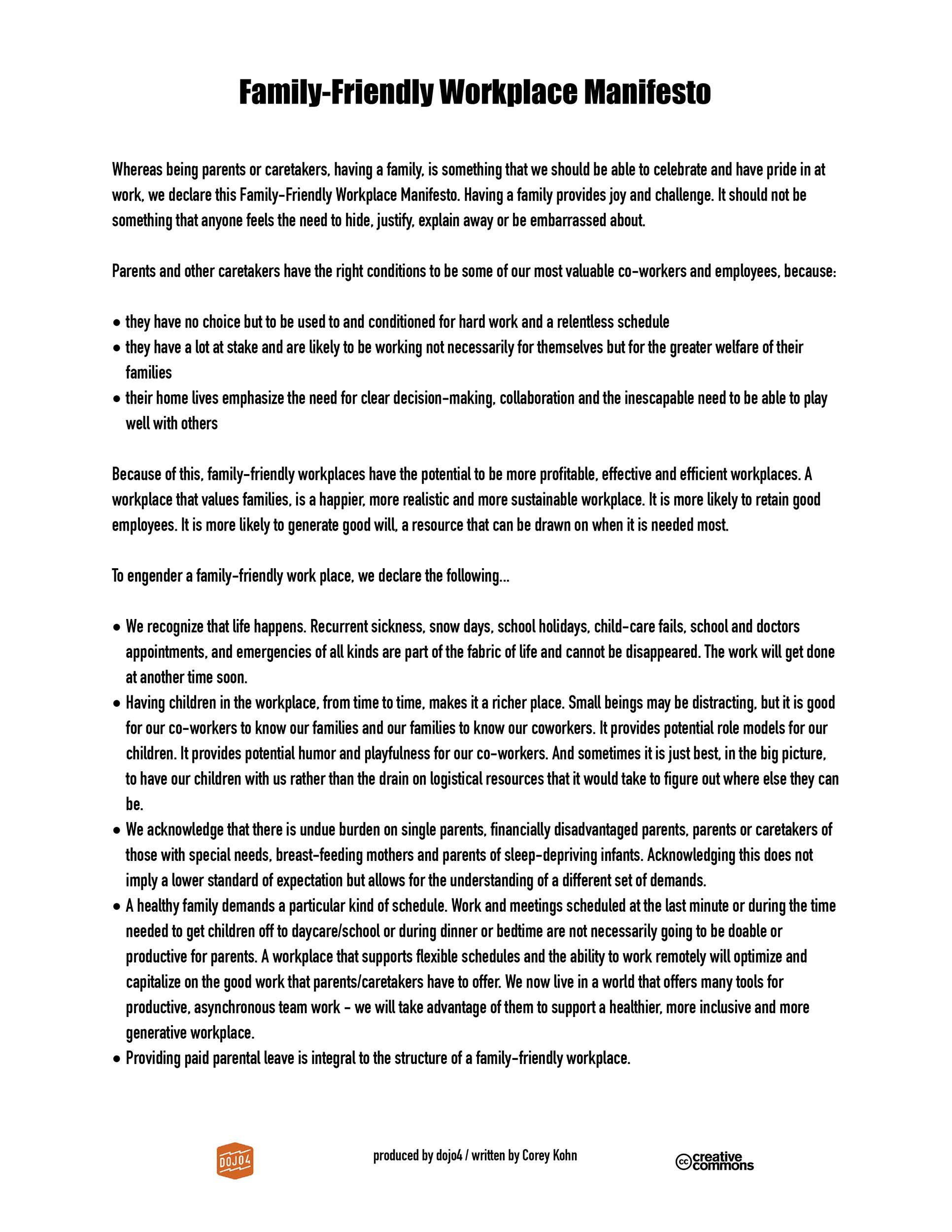 Although they certainly don't have a corner on rich and varied life experiences, I've found that parents have often developed many of these invaluable traits in the process of having and raising children. Families have been immeasurably integral and valuable to our business. In the open-sourced, dojo4 Family-Friendly Workplace Manifesto we note that parents tend to be some of our most valuable team members because: