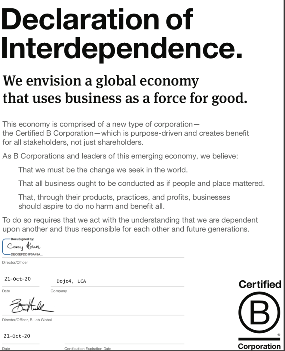 Every certification has its pros and cons, but being B Corp certified has really done nothing but good for Dojo4. Here's the shortlist of why I recommend becoming a B Corp to every company: